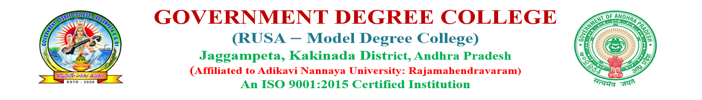 Government Degree College, Jaggampeta was established in the Year 2008, as per G.O. Ms. No. 210 dated 8-9-2008 based on the representations of various People’s Representatives. It is located in Kakinada District and 40 Kilo meters away from the District Headquarters. People of Jaggampeta in and around are mostly depend on Agriculture and allied sectors. Government Degree College, Jaggampeta is affiliated to Andhra University, Visakhapatnam, at the time of its establishment and gave permission to start four Conventional courses viz., B.A (History, Economics and political Science), B.Com. (General), and B.Sc. (Mathematics, Physics, Chemistry) & B.Sc. (Botany, Zoology and Chemistry) from the academic year 2008-09 onwards. Later, with the inception of Adi Kavi Nannaya University, Rajamahendravaram, the college was affiliated to Adi Kavi Nannaya University. Now, we are following CBCS Semester system as per the norms of the affiliating University.